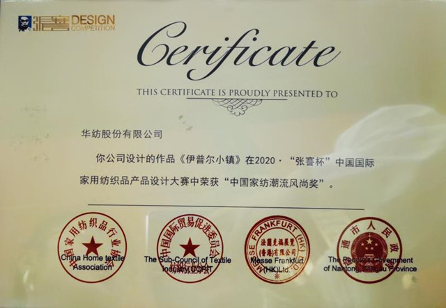 導讀:9月2日,以“潮流·生活”為主題的2020·“張謇杯”中國國際家用紡織品產品設計大賽頒獎盛典在江蘇南通舉行。公司家紡作品《伊普爾小鎮》,榮獲“中國家紡潮流風尚獎”。