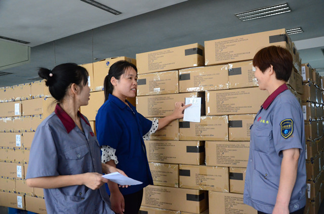 圖為服裝車間計劃管理員陳燕紅(中)在與質量部質檢人員一起,對接即將發出的出口產品。