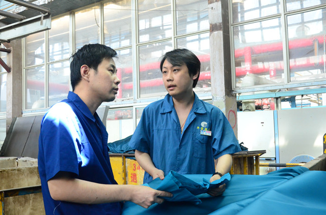 圖為公司家紡車間的趙山松(右)和韓延衛(左)在對比優化工藝后的下機產品。