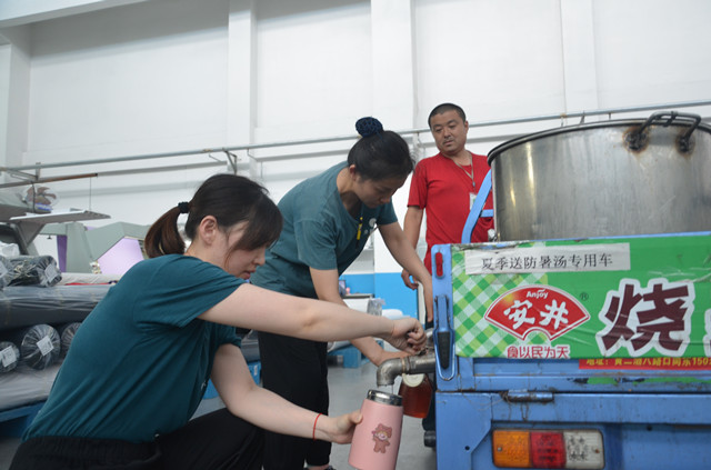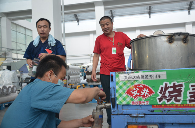 圖為6月20日公司向生產一線發送綠豆湯和西紅柿雞蛋湯的情形。