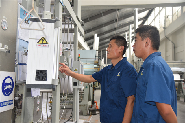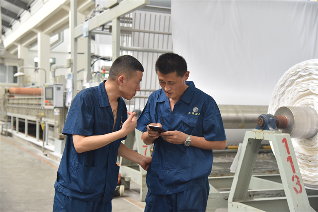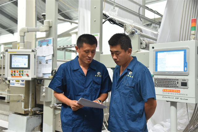 孫鎮(zhèn)身著工裝,每天巡回在車間前處理機(jī)臺之間,和暢的機(jī)聲成了他工作之時的伴奏。落實各機(jī)臺的計劃,組織各機(jī)臺生產(chǎn)跟進(jìn),管控本班的產(chǎn)品質(zhì)量,對操作規(guī)范進(jìn)行及時檢查、現(xiàn)場糾偏與指導(dǎo)培訓(xùn)。他一心撲在工作上,每天忙得不亦樂乎,目標(biāo)是帶領(lǐng)全班19名成員保質(zhì)保量地完成車間下達(dá)的任務(wù)目標(biāo)。他說,“做好生產(chǎn)工作有兩件法寶:一個是責(zé)任感,一個就是精益生產(chǎn)意識。”在孫鎮(zhèn)的心目中,作為公司的管理主線,精益生產(chǎn)需要全體“華紡人”共同傾心“打磨”,在時間里“磨”出真功夫來,干工作沒有捷徑,反復(fù)推敲,仔細(xì)琢磨;經(jīng)過工作實踐的摸爬滾打,才能提升自身本領(lǐng),才會使生產(chǎn)工作一步步精進(jìn)。