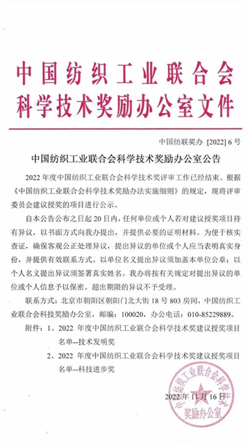 導讀:中國紡織工業(yè)聯(lián)合會向社會公示了“2022年度科學技術獎授獎項目名單”,公司“全流程印染過程數(shù)字化控制技術研究與應用示范”成果,獲得全國紡織行業(yè)2022年度技術進步獎二等獎。