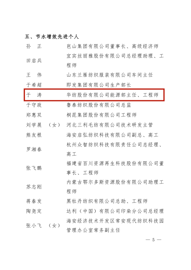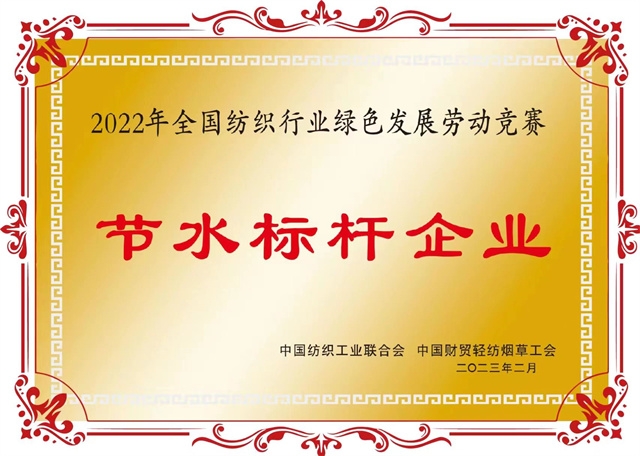 導(dǎo)讀:公司在全國紡織行業(yè)綠色發(fā)展勞動競賽中獲評“節(jié)水標桿企業(yè)”榮譽稱號、公司系統(tǒng)工程部能源副總工于濤榮獲“節(jié)水增效先進個人”榮譽稱號。