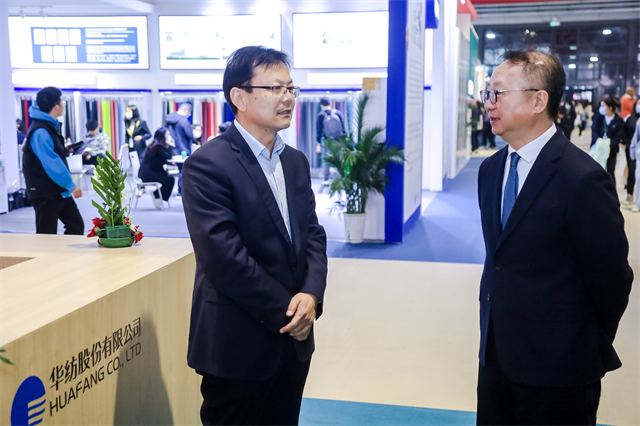 期間,中國紡織工業(yè)聯(lián)合會會長孫瑞哲,國家紡織產品開發(fā)中心主任李斌紅,國家紡織產品開發(fā)基地秘書處秘書長、中國紡織信息中心產品開發(fā)部主任陳小麗等到公司展位觀展。在與公司黨委書記、董事長盛守祥及服裝面料分公司總經理王超交流中,孫瑞哲提到,華紡作為中國紡織印染行業(yè)的龍頭骨干企業(yè),要加強與參展企業(yè)交流溝通,既要展現(xiàn)公司魅力,又要做好信息交換、交流學習等相關工作,抓住機會,拓展品牌影響力,為公司開拓市場、擴大知名度,實現(xiàn)從制造加工向品牌創(chuàng)意的轉型升級夯實基礎。