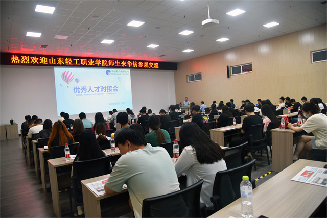 交流會上,孫玉濤圍繞企業概況、福利待遇、人才隊伍建設及人員需求進行介紹并現場答疑。花布車間化驗室打樣員邱淑超、化工工業公司技術員尚高揚作為山東輕工職業學院校友,以他個人在公司的成長經歷,生動地為學生們分享了職場經驗。在人才方面,公司尤其重視對青年一代的培養,特別歡迎有志青年加入公司,為公司發展注入年輕活力。