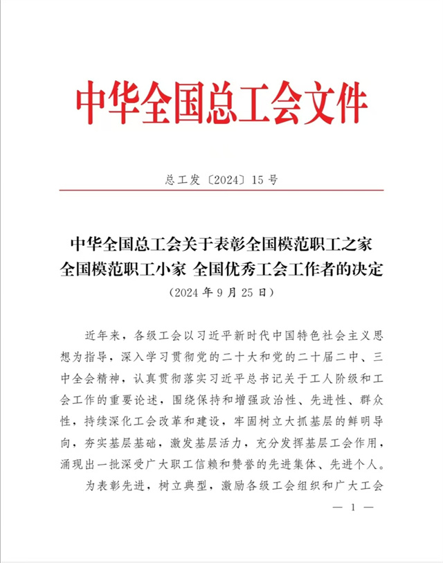 “全國模范職工之家”是中華全國總工會設立的授予全國工會系統(tǒng)先進集體的最高榮譽,是對基層工會工作的最高褒獎和肯定。公司工會在公司黨委領導下,以習近平新時代中國特色社會主義思想為指導,深入學習貫徹黨的二十大和黨的二十屆二中、三中全會精神,認真貫徹落實習近平總書記關于工人階級和工會工作的重要論述,牢固把握正確政治方向,充分發(fā)揮橋梁紐帶作用,切實維護職工合法權益,努力構建和諧勞動關系,不斷增強工會組織的引領力、組織力、服務力,為公司高質量發(fā)展貢獻工會智慧和力量。