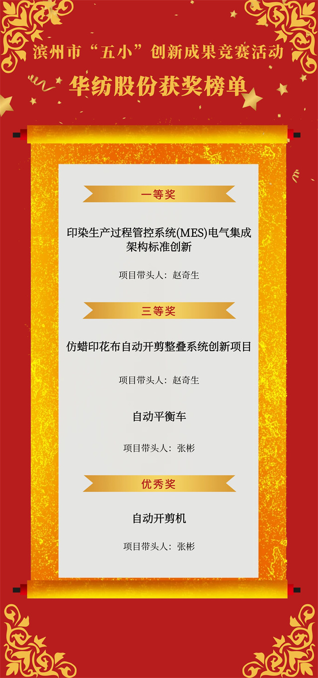 近日,市總工會開展的濱州市“五小”創(chuàng)新成果競賽活動獲獎名單公布,公司申報的4項“五小”競賽創(chuàng)新成果喜獲殊榮,其中,《印染生產(chǎn)過程管控系統(tǒng)(MES)電氣集成架構(gòu)標準創(chuàng)新》獲一等獎,《仿蠟印花布自動開剪整疊系統(tǒng)創(chuàng)新項目》《自動平衡車》獲三等獎,《自動開剪機》獲優(yōu)秀獎。