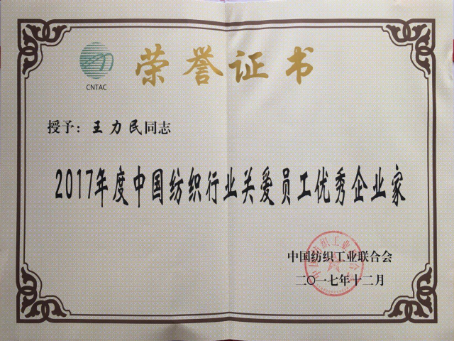 導讀:日前,中國紡織工業聯合會2017年人才工作大會在濟南召開,公司榮獲“2017年度中國紡織行業人才成長最佳企業”稱號;王力民榮獲“2017年度中國紡織行業關愛員工優秀企業家”稱號。